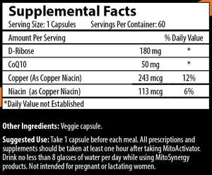 Some dietary supplements may interact with other supplements or prescription and over-the-counter medicines. Taking a combination of supplements or using the products with medications (whether prescription or OTC drugs) can cause side-effects. Please consult your physician before taking any supplements of any kind. In order to receive optimum results and allow the unique ingredient to perform at its highest level you must take MitoSynergy two hours before any other minerals, vitamins, supplements and/ or any (OTC) or prescribed medications.